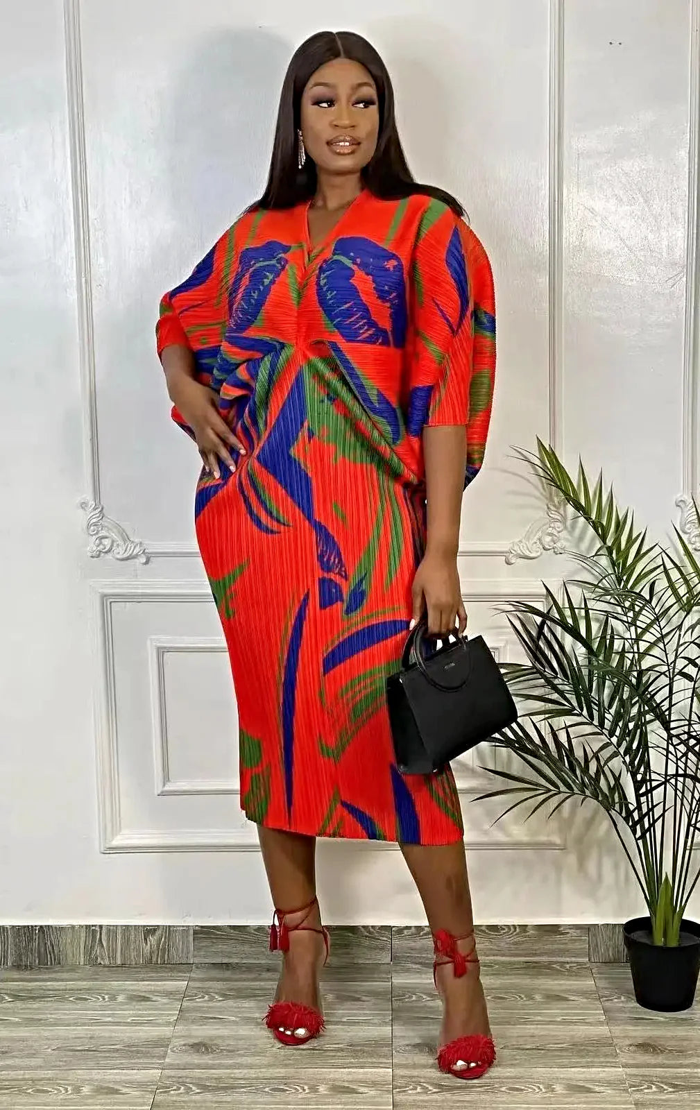 The LEAF PATTERN PLEATED DRESS is a breath of fresh air — bold, breezy, and effortlessly chic. With striking batwing sleeves and flowy plisse pleats, it’s giving tropical goddess vibes with a side of sass. Ready to turn heads? This dress already is.