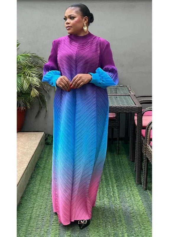 The OMBRE MAXI PLISSE DRESS is pure elegance with a bold twist! Featuring a mesmerizing gradient that flows effortlessly with every step, this dress is giving drama, grace, and major main-character energy. Whether you're floating into a soirée or owning the streets, this stunner guarantees all eyes on you!