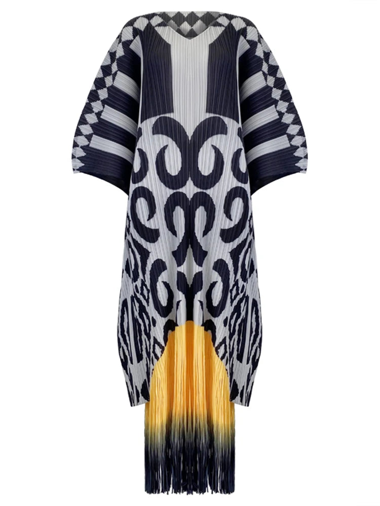 PLEATED VINTAGE TASSEL DRESS – A whole vibe wrapped in pleats and dripping in bold tassels! With its geometric print and statement-making flair, this dress is here to turn heads and steal the spotlight. Get ready to twirl, stun, and slay effortlessly!