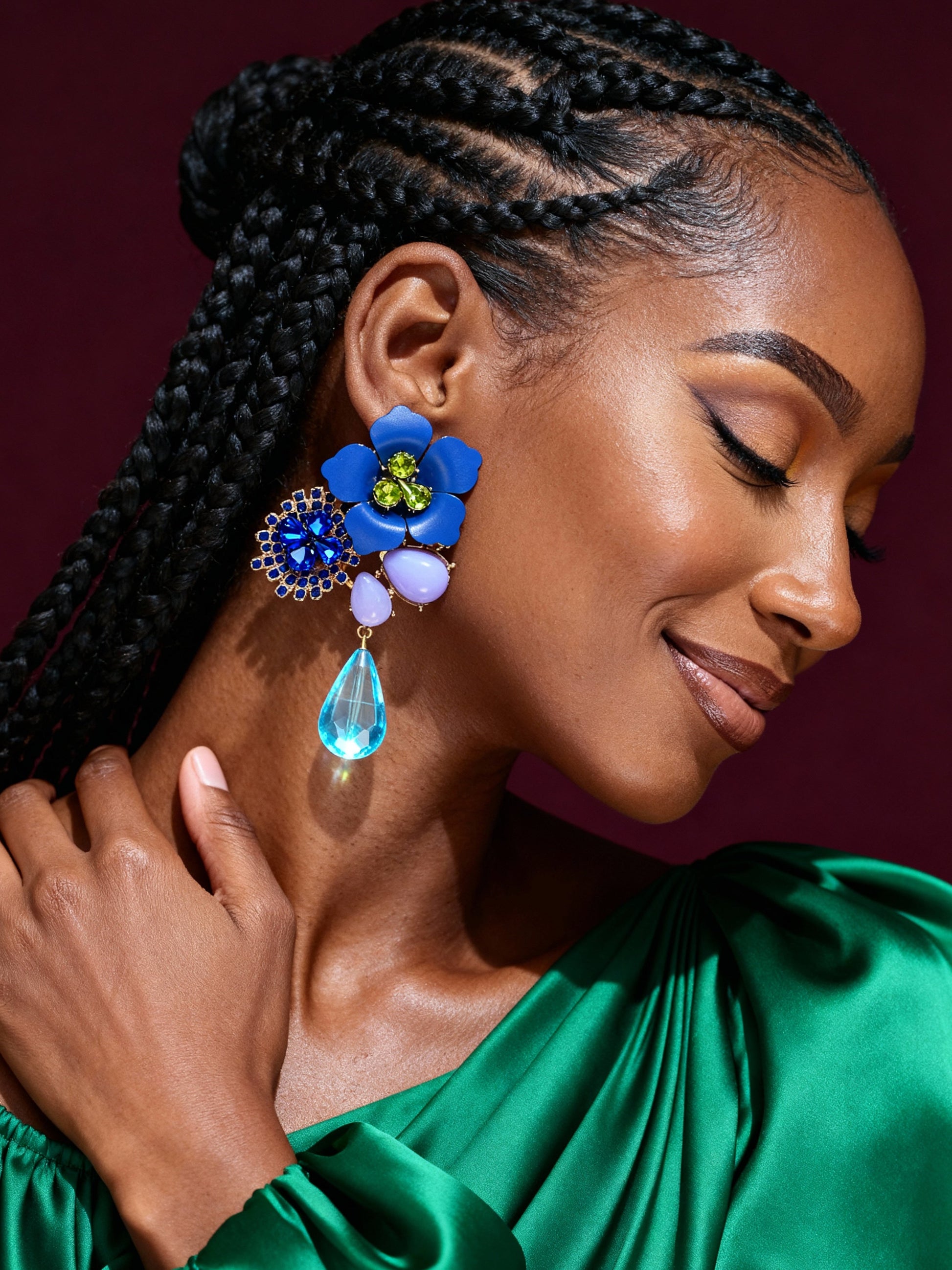 The RHIANNA CRYSTAL FLORAL EARRINGS are here to make sure all eyes are on YOU! With dazzling crystals and a bold floral design, these earrings scream luxury and drama—because subtlety is overrated. Wear them, flaunt them, and let them do the talking.