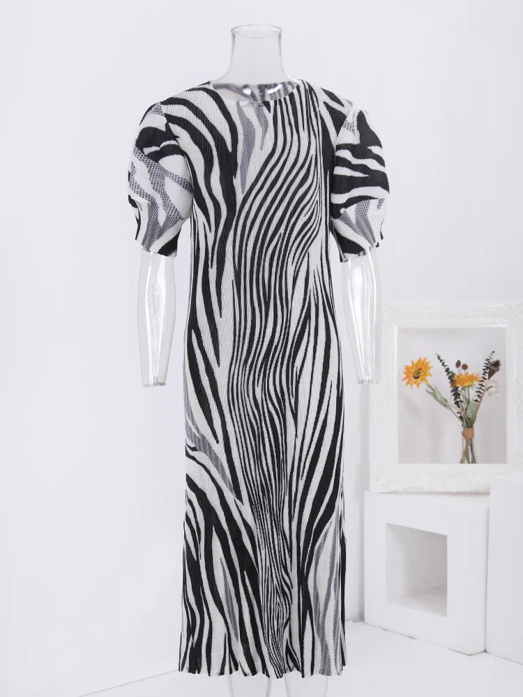 The ZEBRA STRIPE PLISSE DRESS isn’t here to play — it’s here to slay. With bold, high-contrast stripes and flowing pleats that move with you, this dress is the perfect blend of wild and sophisticated. This statement piece guarantees you’ll steal the spotlight — unapologetically fierce, effortlessly fabulous.