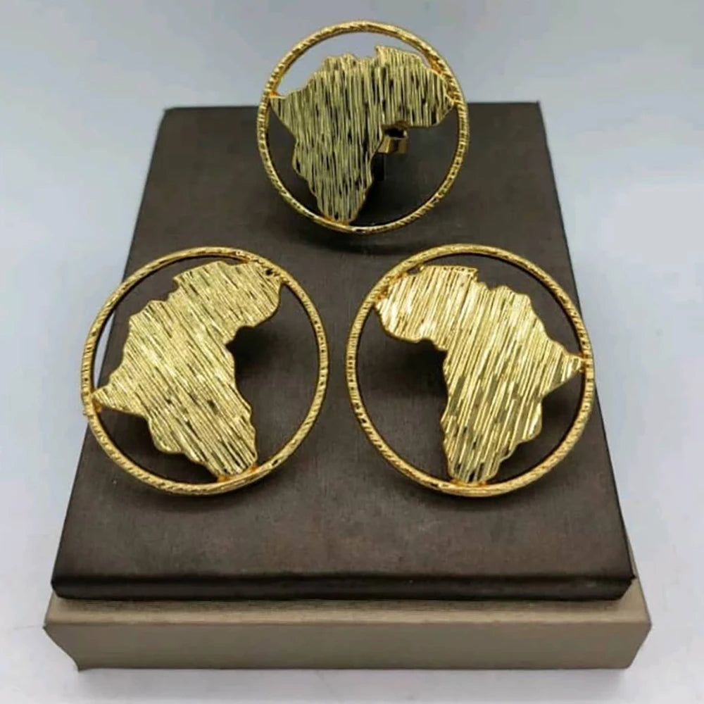 The Africa Circle Earrings Set is a whole statement—bold, meaningful, and dripping in cultural pride. Featuring the iconic African map set in a sleek circular design, this matching earrings and adjustable ring set brings heritage to the spotlight with modern-day glam. Crafted from durable African stainless steel brass, it’s built to last and made to shine.