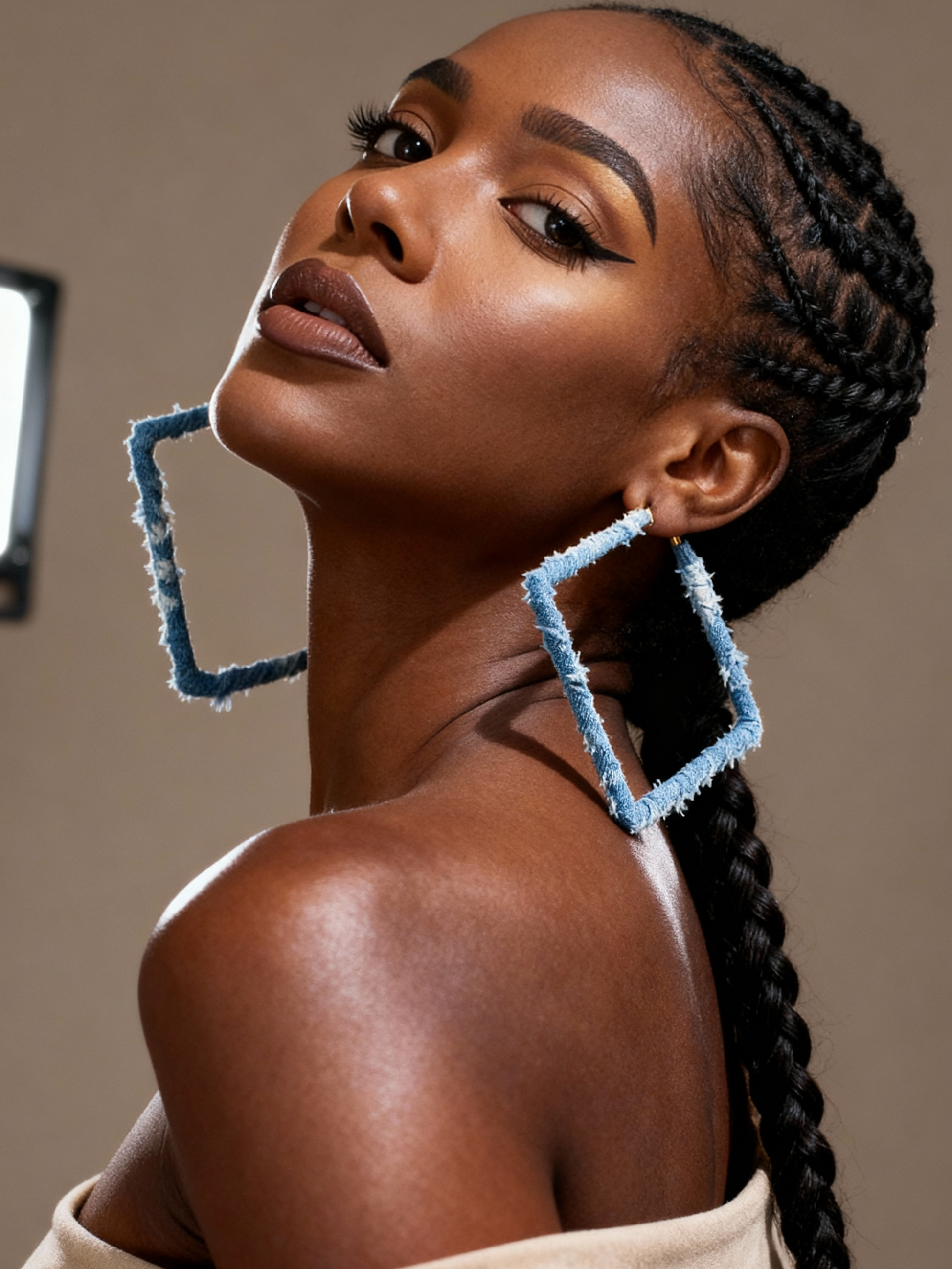 The GEOMETRIC DENIM HOOPS are serving bold structure with a laid-back twist. Featuring a unique geometric shape wrapped in denim fabric, these hoops are where edgy meets effortlessly cool. Lightweight, standout, and totally unexpected—they're the perfect combo of street style and statement glam.