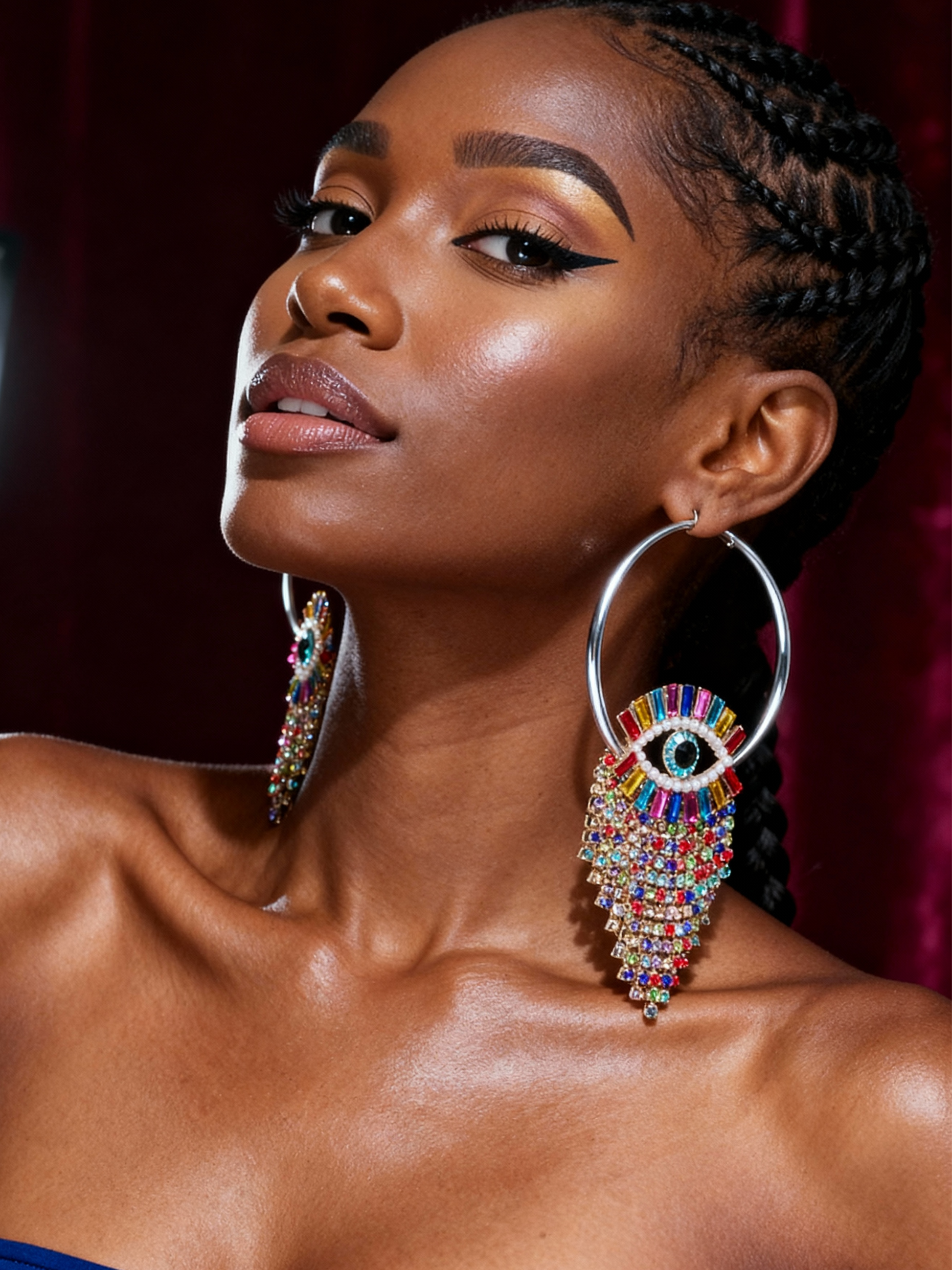 The ORATI CRYSTAL HOOPS are where glam meets mystique! Adorned with dazzling rhinestones and an eye detail that brings all the allure, these hoops are here to make a statement. Watch the compliments roll in!