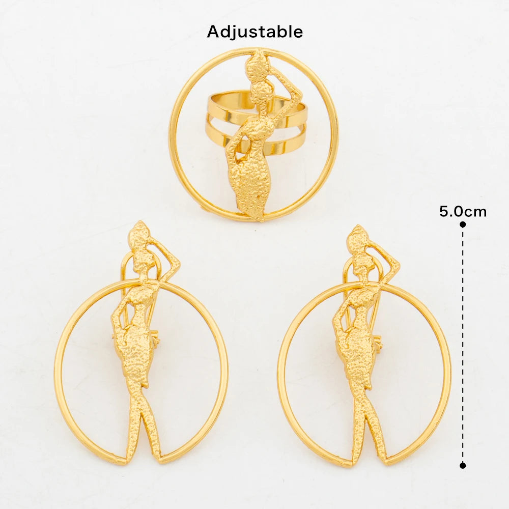 The Queen Mother Earrings Set is pure royal energy—bold, regal, and deeply rooted in heritage. Inspired by African queenly power and crafted from durable African stainless steel brass, this matching earrings and adjustable ring set is made to last and built to shine. Every curve and cut pays homage to strength, grace, and legacy.