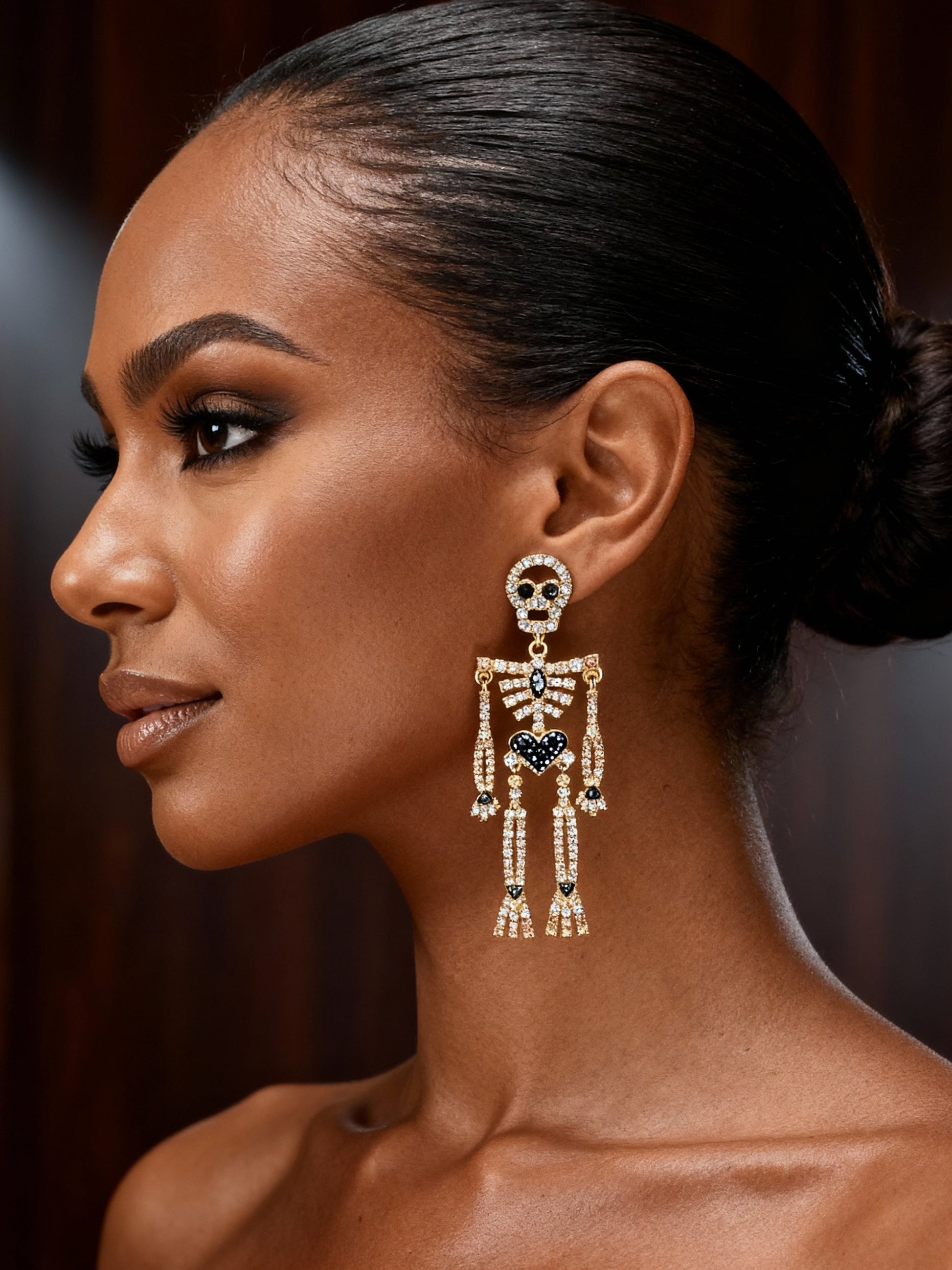 The SKELLY CRYSTAL TASSEL EARRINGS are your new go-to for sparkle, sass, and star power! Featuring a skelleton shaped earrings dripping in crystals and playful tassels that swing with every step, these earrings are made for dancing, dazzling, and doing the most. Crafted from 18k gold-plated alloy, they’re lightweight, fabulous, and guaranteed to bring the shine.
