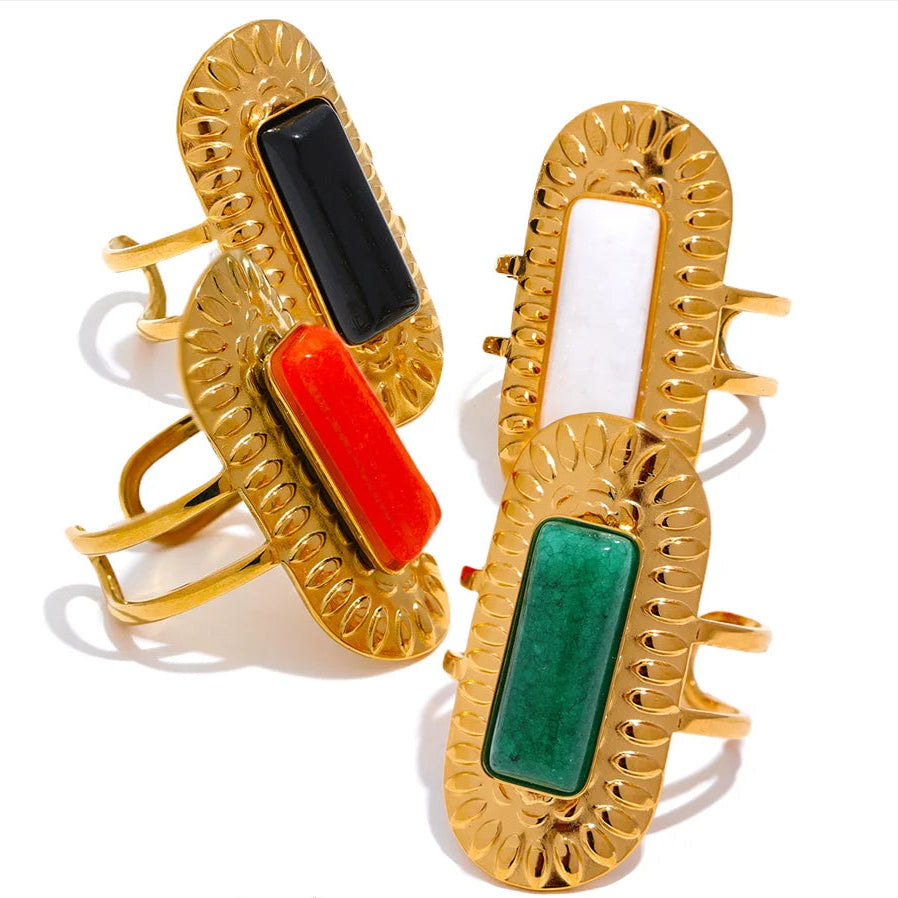 SQUARE JOY RINGS Sugar, spice, and serious sparkle. These bold, adjustable rings bring the drama with juicy pops of color and a chunky, statement-making vibe. Stack them high or rock them solo—either way, you're serving confidence with a side of candy-coated glam. One size fits most, but the attitude? That’s all you.